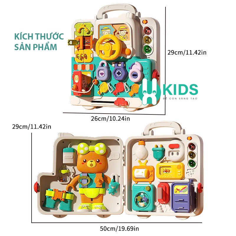 Thông tin chi tiết sản phẩm Đồ chơi bảng bận rộn Montessori Busy Board đa năng 3 mặt có đèn nhạc giáo dục sớm phát triển tư duy kĩ năng sống cho bé: