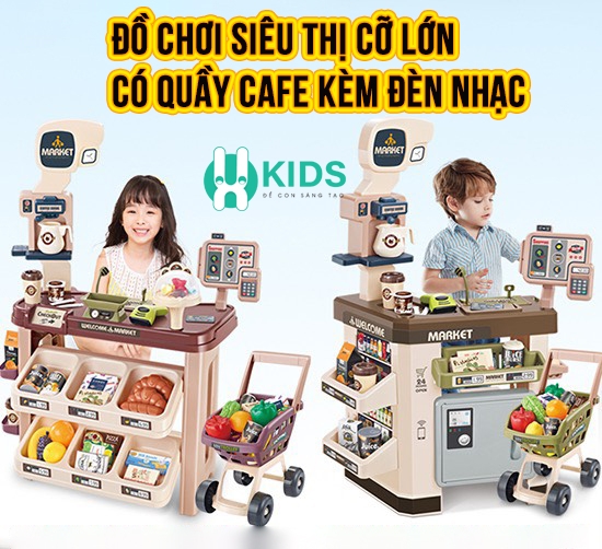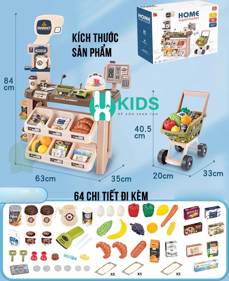 Đồ chơi siêu thị bán hàng size to lớn 64pcs kèm xe đẩy có quầy pha cafe, quầy tính tiền, máy quẹt thẻ có đèn nhạc cho bé là mẫu đồ chơi nhập vai nhân viên bán hàng cực kì thú vị của X- KIDS. Bộ đồ chơi bán hàng siêu thị cho bé là sự lựa chọn tuyệt vời để cho các bé chơi trò chơi nhập vai thành một người bán hàng thu ngân chuyên nghiệp.